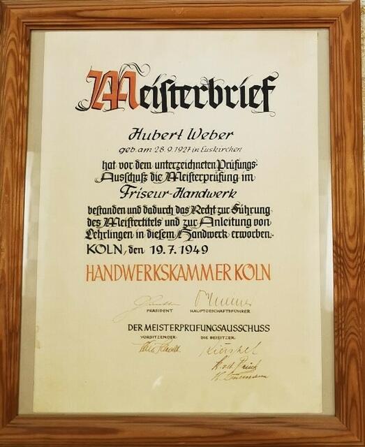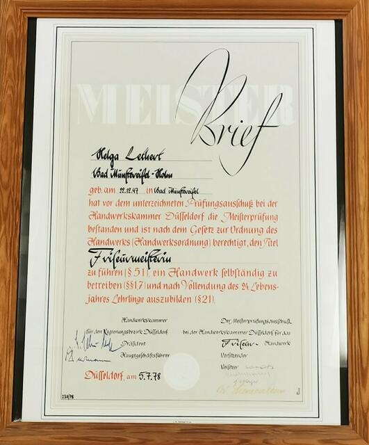 Mit 21 Jahren durfte damals Christian Weber seinen Meisterberbrief in Empfang nehmen. Jüngste im Bunde der Meister Helga Lethert geborene Weber. Sie hatte zuvor eine Schule in Düsseldorf besucht und als „herausragende Jungmeisterin“ die beste Note von allen. Bekam Helga Lethert von dieser Schule sogar das Angebot in Düsseldorf zu bleiben, um theoretisch und praktisch zu unterrichten. „Doch ich wusste damals schon, dass ich den elterlichen Betrieb nicht im Stich lassen würde,“ so Helga Lethert.