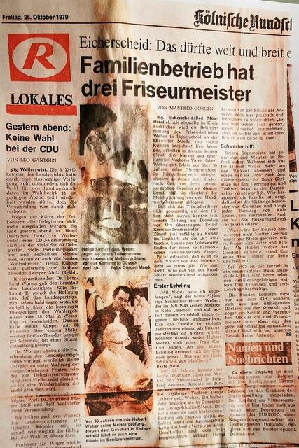 Und schon im Herbst 1979 sorgte der Eicherscheider Familienbetrieb Weber für kreisweites Aufsehen über den sich auch der damalige Kreishandwerksmeister Josef Zingel aus Bad Münstereifel sehr freute. Ebenso der damalige Landrat Josef Linden: Einen Familienbetrieb mit gleich drei Friseurmeister. Das wurde in der örtlichen Presse zu jener Zeit schon von diesem Reporter, der nun auch den letzten Akt dieses Friserubetriebs beschreibt, als „einmalig im Kreis Euskirchen“ beschrieben. Nachdem Vater Hubert Weber schon damals auf über 30Jährige Tätigkeit als Meister zurückblicken durfte, ahmten auch dessen Kinder es ihm nach. Zwei von drei Geschwistern fanden so großen Gefallen an diesem Beruf mit Schere und Kamm umzugehen, dass auch sie die Meisterprüfung ablegten. Dabei damals als Gesellin auch Carola Weber, heute Hück, die nach ihrer Hochzeit nach Köln zog und nicht mehr weiter mit im Betrieb arbeitete.