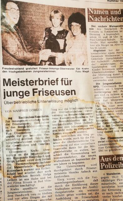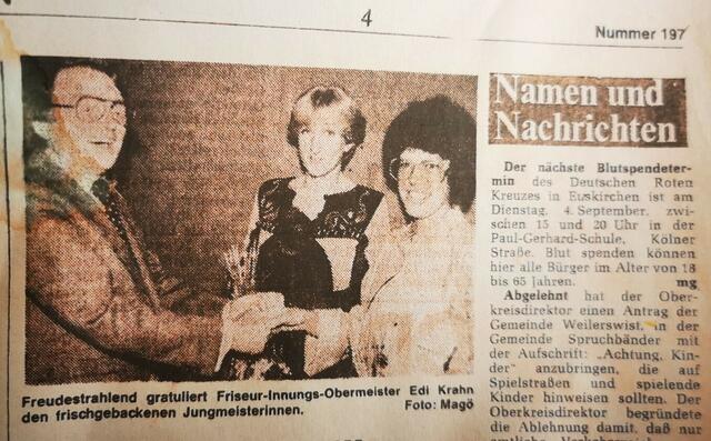 Bereits am 1. April waren es auf den Tag genau sechzig Jahre her, seitdem sie ihren Beruf mit Elan und Leidenschaft begonnen hatte und damals die Meisterin mit den besten Noten in einer Düsseldorf Schule war. Gratulierte damals auch Friseur-Innungs-Obermeister Edi Krahn aus Euskirchen der Jungmeisterin.