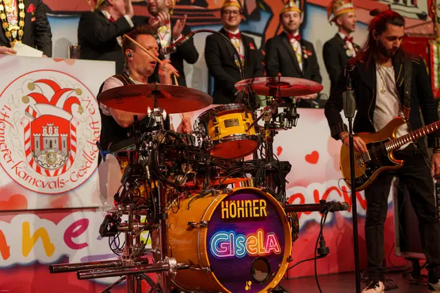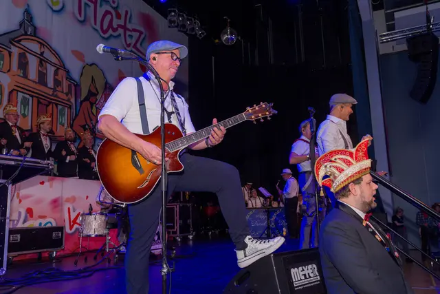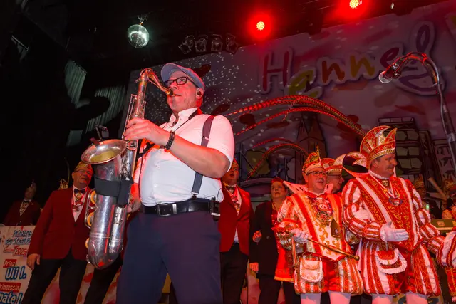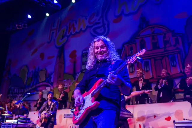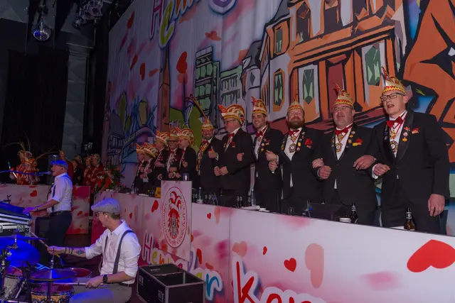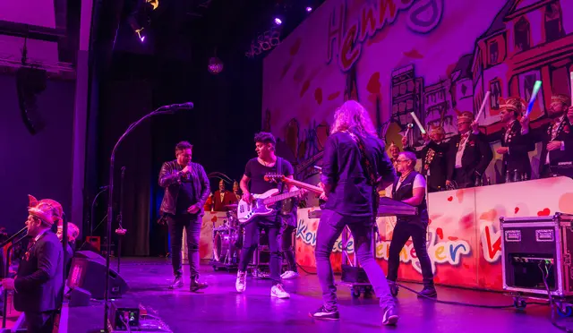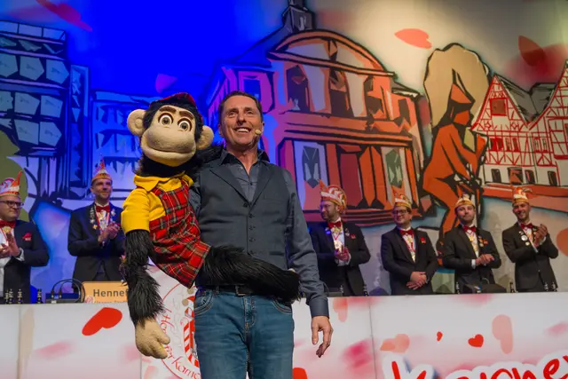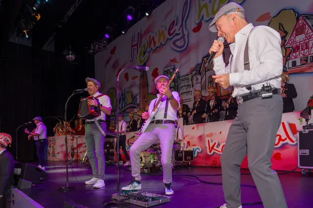 Nach diesen Formalien geleitete das Traditionskorps der Kölner Altstädter mit sehr lauten Klängen das Hennefer Prinzenpaar Uli I. & Renate I. auf die Bühne. Die Tollitäten warben für ihre soziale Spendenaktion und erhielten dafür von der Hennefer KG einen Scheck über 333 Euro. Für den erkrankten Volker Weininger sprang Klaus & Willi ein. Willi ist nicht nur ein Affe, sondern eine Art „eierlegende Wollmilchsau“ für die Bühne, was das Publikum begeisterte. Die „Höhner“ hatten mit ihrem Lied „Gisela“ zwar nicht die Mutter von Pit Raderschad gemeint, aber Frontsänger Patrick Lück begrüßte sie an der Bühne. Das Orchester Sepp Dietrich begleitete musikalisch alle Songs der Höhner, was deren Auftritt noch stimmungsvoller machte.