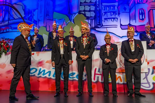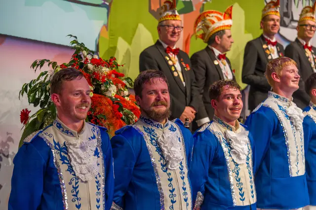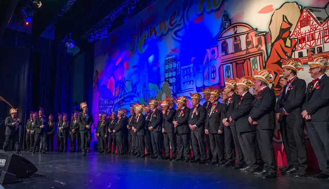 Für den traditionellen Ein- und Ausmarsch der befreundeten Gesellschaften zu Beginn nahmen die Freunde der „Coburger Narrhalle“ die weiteste Anreise wieder auf sich. Nachdem auch die ganze Männerschaft der Hennefer KG auf der Bühne stand, begrüßte Präsident Eric Raderschad die wunderbar bunt kostümierten Jecken im Saal. Matthias Schwarz, Amaro Schwekutsch und Luca Sekula stellte er als neue Mitglieder des Elferrats vor. Als Elferratsanwärter müssen sich Ralf Dzikus und Patrick Bröhl bewähren. Rico Jensen, Markus Korell und Martin Bruns sind die neuen Senatoren der KG.