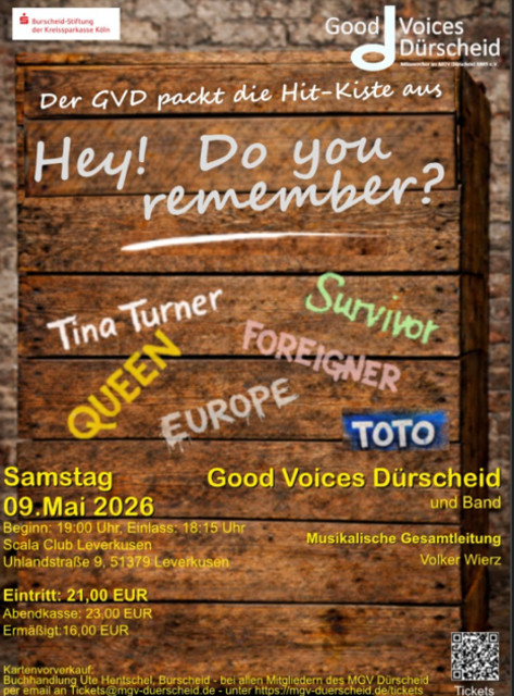 Leverkusen. Es gibt Konzerte – und es gibt Abende, die man noch lange spürt. Am Samstag, den 9. Mai, versprechen die Good Voices Dürscheid genau so ein Erlebnis. Unter dem Motto „Hey! Do you remember?“ wird der Scala Club zur Bühne für Erinnerungen, Gänsehaut und pure musikalische Energie.
