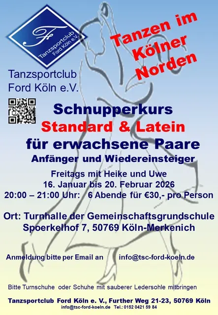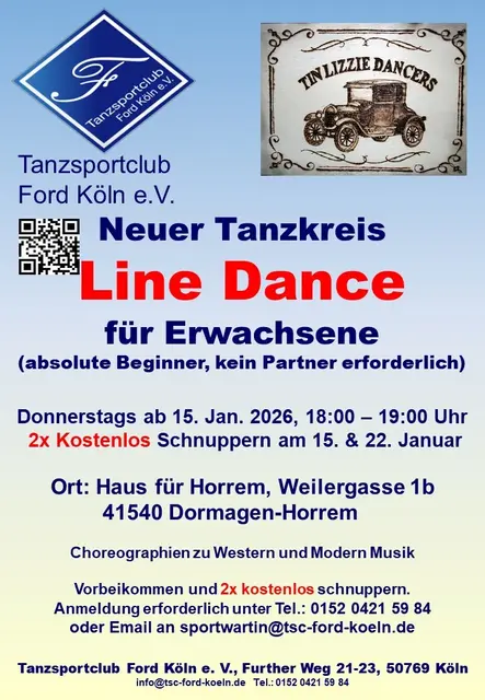 Du möchtest gerne tanzen, hast aber keine:n Partner:in? Bei den Tin Lizzie Dancers im TSC Ford Köln e.V. kein Problem! Im LINE DANCE wird in choreographierter Formation ohne Partner:in zu Western und Modern Musik getanzt. Du kannst alleine, mit Partner:in oder mit Freunden teilnehmen. Im Vordergrund steht immer der Spaß am Tanzen, und der ist garantiert. Am Donnerstag 15. Januar um 18 Uhr startet ein neuer LINE DANCE Tanzkreis für Anfänger ohne Vorkenntnisse. Gerne darfst Du 2x kostenlos eine...