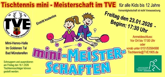 TVE1905 Bad Münstereifel Am 23. Januar2026 steht Bad Münstereifel ganz im Zeichen des Tischtennis-Nachwuchses: Bei der Mini-Tischtennismeisterschaft sind alle Kinder bis 12 Jahre eingeladen, ihr Können an der Platte zu zeigen. Mitmachen können alle Mädchen und Jungen im Alter bis zu 12 Jahren. Die Teilnahme ist kostenlos und ohne jede Verpflichtung, dafür mit hohem Spaß- und Bewegungsfaktor. Eine Vereinsmitgliedschaft ist nicht Voraussetzung. Das Turnier richtet sich sowohl an Anfängerinnen und...